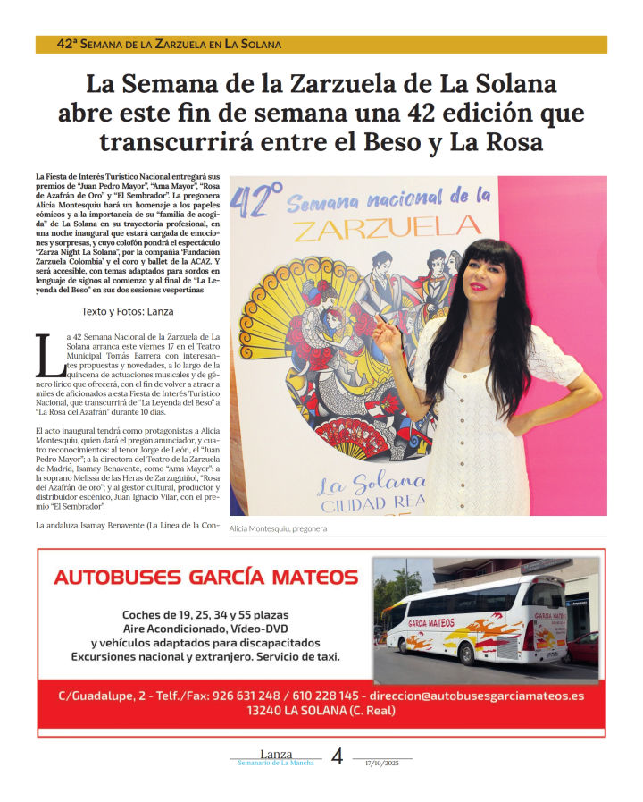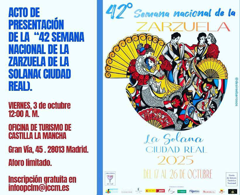 La 42ª Semana de la Zarzuela de La Solana, Fiesta de Interés Turístico Nacional, que se celebrará del 17 al 26 de octubre de 2025, contará con la tiple cómica, actriz y cantante Alicia Montesquiu como pregonera, en una edición en la que se reconocerá al tenor Jorge de León; a la directora del Teatro de la Zarzuela, Isamay Benavente, y al director y productor teatral Juan Ignacio Vilar, entre otros, según se presentó hoy en la Oficina de Turismo de Castilla-La Mancha en Madrid.
