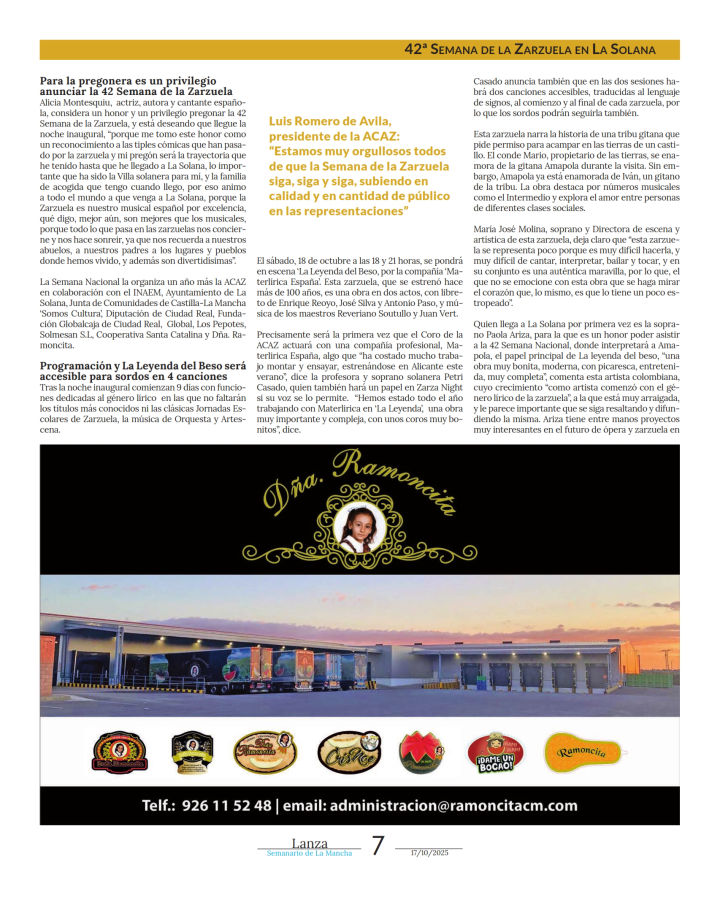 Finalmente, el presidente de la Asociación Cultural Amigos de la Zarzuela (ACAZ), Luis Romero de Ávila, ha animado a los aficionados y melómanos a sumarse a esta cita con el género lírico, única en Castilla-La Mancha y en España, que sumerge a La Solana en un mundo singular durante 10 días, y que aspira a ser declarada Fiesta de Interés Turístico Internacional. Por su parte, Romero de Ávila destacó “el orgullo compartido por mantener y elevar la calidad y cantidad de las representaciones realizadas año tras año”, y expresó su agradecimiento a todas las instituciones colaboradoras, incluyendo al Ayuntamiento de La Solana, la Diputación, la Junta de Comunidades, el INAEM y las empresas patrocinadoras, por su apoyo constante a la zarzuela.
