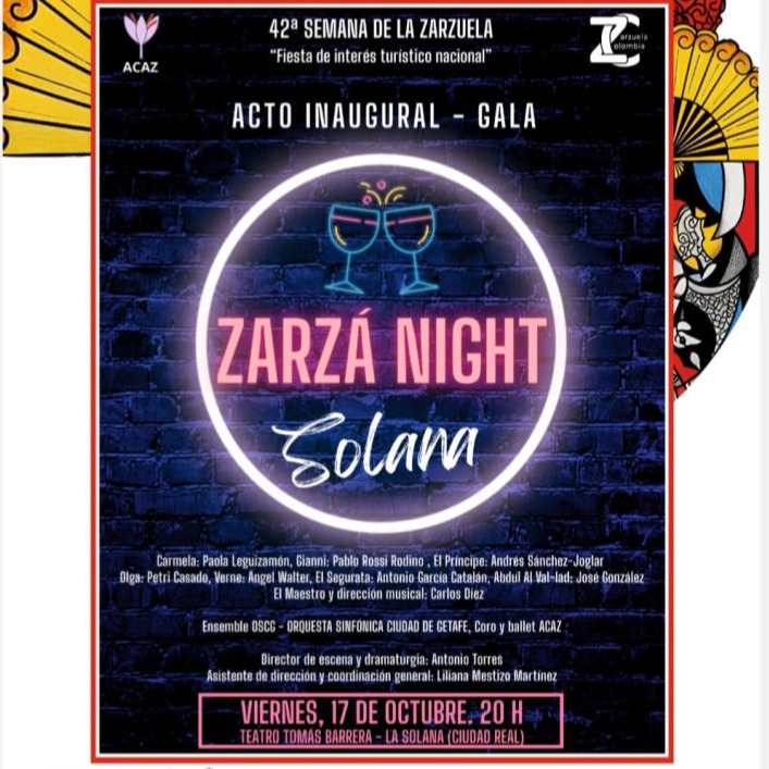 Cerrará la noche el estreno del espectáculo “Zarza Night La Solana”, por la compañía ‘Fundación Zarzuela Colombia’ y el coro y ballet de la ACAZ, que discurre en nuestra era, en el interior de una conocida sala de fiestas solanera, la Zarza Night Solana, con todos los personajes de la noche entre camareros, guarda de seguridad, bailarinas, orquesta local, ritmos y colores exóticos, en suma una noche llena de sorpresas y mucho sabor.