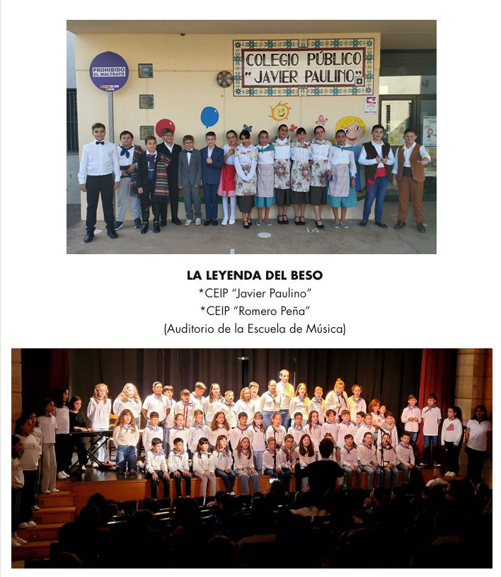 Así en el Auditorio de la Escuela de Música, los escolares de los CEIPs Romero Peña y Javier Paulino se atreverán con algunas escenas de “La Leyenda del Beso”, especialmente el Intermedio, con letra del grupo Mocedades (coro infantil) y un guion adaptado de La leyenda.